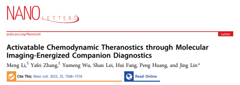 近日,深圳大学医学部生物医学工程学院林静特聘教授团队在Nature Index期刊《Nano Letters》(影响因子9.1)上发表了题为“Activatable Chemodynamic Theranostics through Molecular Imaging-Energized Companion Diagnostics”的研究论文。医学部博士后李萌和硕士生张亚飞为共同第一作者,林静教授为通讯作者,深圳大学为第一完成单位。该团队所在的生物医学工程学科属于广东省优势重点学科。