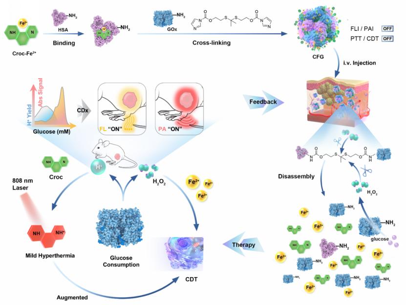 基于TME响应性硫缩酮交联剂,可激活化学动力学诊疗剂(CFG)可实现过氧化氢(H2O2)触发的葡萄糖氧化酶(GOx)释放,时空锁定CDT激活区域,显著提升治疗特异性并降低脱靶风险。