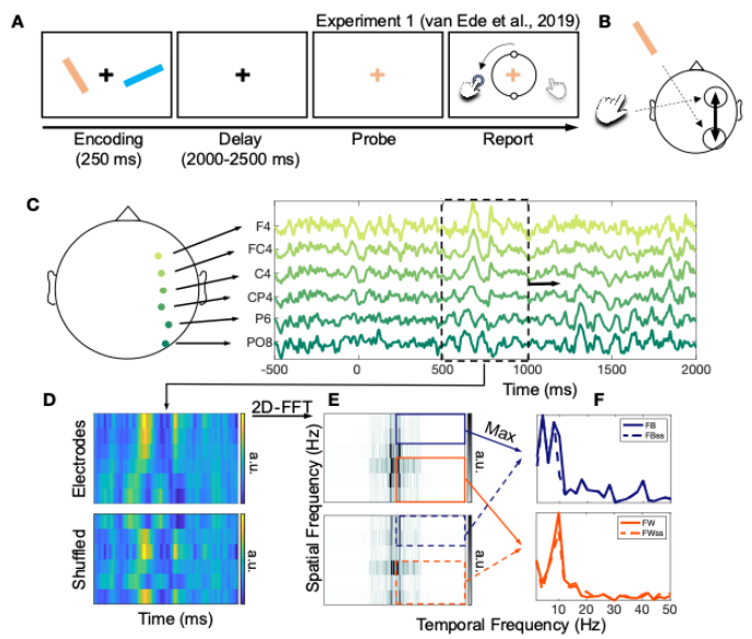 为此,研究者分析了两个公开数据集(实验一和实验二)。通过对实验一的数据进行分析,首先检验了在基于记忆执行反应时,任务相关脑区之间是否存在行波。在实验一中,被试需要记住并回忆呈现在左侧或右侧视野中的线条方向,并用左手或右手作出反应(图1A)。实验中,线条位置与反应手的组合完全随机,例如左侧刺激用左手反应,左侧刺激用右手反应等。这样的设计有助于分离出与刺激位置和反应手相关的任务相关脑区(即对侧脑区),从而有针对性地探测这些区域之间的行波活动(图1B)。随后,研究者对任务反应阶段的脑电信号进行了行波分析。该分析方法将脑电信号表示为一个以电极为纵轴、时间为横轴的二维图像,通过识别图像中是否存在具有明确方向的时空结构,来探测潜在的行波活动(图1C–F)。