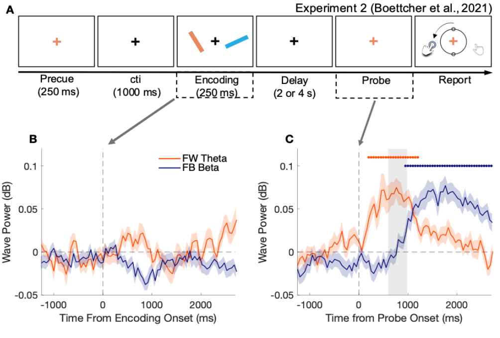 为进一步确认这些行波是否与行动过程直接相关,而非仅仅反映任务准备状态(task set),研究者分析了另一组数据(实验二)。在该实验中,被试虽然提前知道需要报告的刺激内容和需要使用的反应手,但必须等待数秒才能作答(图3A)。结果发现,在等待期间未观察到前馈 theta 或反馈 beta 行波(图3B),只有在实际执行反应的过程中,这些行波才出现(图3C)。这一结果表明,所观察到的行波并非与行动准备有关,而是与反应执行过程本身相关。