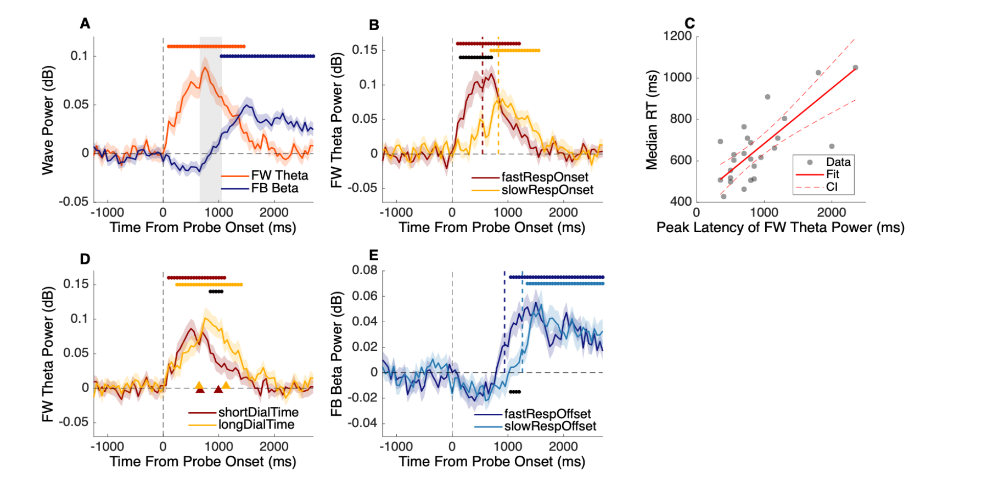 结果显示,在反应阶段,在任务相关的感觉与运动区范围的电极之间,出现了显著的前馈 theta(2–6 Hz)行波和反馈 beta(14–32 Hz)行波。前馈 theta 行波出现在反应开始之前,并在反应启动时达到最大强度,其活动能够预测被试的反应起始时间和持续时间(图2A–D)。在反应结束后,出现了反方向传播的 beta 行波,其出现时间可以预测被试反应的结束时间(图2A、E)。