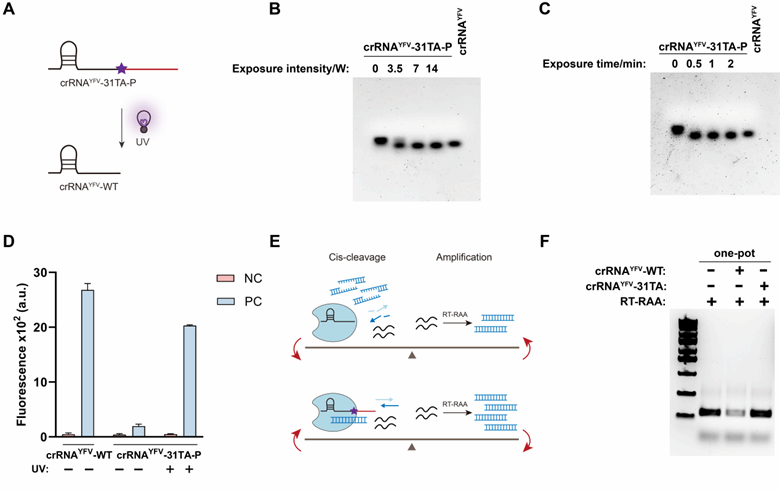 本研究开发了一种通用光控CRISPR/Cas12a一锅法检测平台,通过在crRNA 3’末端引入光可切割(PC)DNA linker修饰,实现了虫媒病毒的快速、高灵敏度检测,整个流程可在30分钟内完成。 临床样本检测结果证实,该平台对12份虫媒病毒样本(6份黄热病毒阳性、6份阴性对照)的检测结果与RT-qPCR 100%吻合,且能精准区分黄热病毒与寨卡、登革等其他蚊媒病毒。