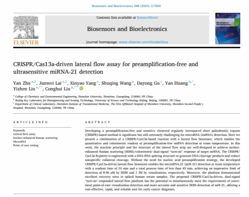 近日,深圳大学化学与环境工程学院刘聪慧助理教授、刘翼振副教授联合北京科技大学黄炎博士在期刊《Biosensors and Bioelectronics》(影响因子10.7,中科院 1区TOP)上发表了题为《CRISPR/Cas13a-driven lateral flow assay for preamplification-free and ultrasensitive miRNA-21 detection》的研究论文。深圳大学化学与环境工程学院硕士研究生朱炎和赖俊炜为共同第一作者,深圳大学为第一完成单位。