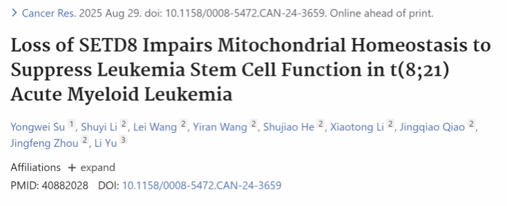 2025年8月29日,深圳大学卡尔森国际肿瘤中心、深圳大学总医院血液肿瘤科于力教授与周景峰助理教授合作在肿瘤学Top期刊《Cancer Research》 (IF =16.6, Nature Index杂志)上发表了题为“Loss of SETD8 Impairs Mitochondrial Homeostasis to Suppress Leukemia Stem Cell Function in t(8;21) Acute Myeloid Leukemia”的研究论文。该研究发现靶向表观遗传组蛋白甲基转移酶SETD8可以有效杀伤t(8;21)急性髓系白血病干细胞,为克服t(8;21)急性髓系白血病复发及耐药提供了新的靶标及靶向干预新策略。已出站博士后苏永伟为第一作者,于力教授为最后通讯作者,周景峰助理教授为共同通讯作者。深圳大学总医院血液肿瘤科李舒宜、王蕾、王怡然、贺淑娇、乔静巧,已毕业硕士生李晓彤共同参与了本研究,深圳大学为第一完成单位。