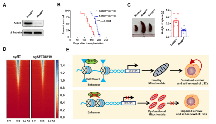 白血病干细胞是 t(8;21) 急性髓系白血病复发与耐药的核心驱动力,由表观遗传重塑介导的染色质可及性重构是白血病干细胞的重要特征,赋予其超强的生存及自我更新优势。本研究综合运用基因敲除小鼠模型、病人细胞、病人来源的异种移植模型等系统揭示了赖氨酸甲基转移酶 SETD8(催化组蛋白 H4 第 20 位赖氨酸单甲基化,H4K20me1)是维持白血病干细胞干性不可或缺的表观遗传调控因子。在机制上,SETD8 通过增强增强子染色质可及性来促进线粒体外膜蛋白 RHOT1 的表达,从而重编程线粒体稳态。该研究发现了组蛋白赖氨酸甲基化、增强子染色质可及性及线粒体稳态之间的联系,为克服t(8;21)急性髓系白血病复发及耐药提供了新的靶标及靶向干预新策略。