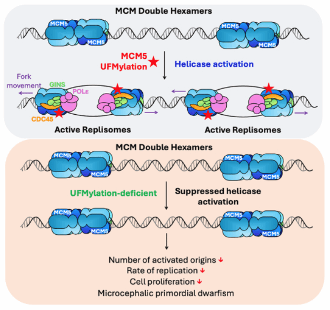 近日,深圳大学医学部许兴智教授团队和Shunichi Takeda教授团队联合在《The EMBO Journal》期刊发表了题为“MCM5 UFMylation regulates replication origin firing and fork progression”的研究论文。该研究首次揭示了UFM1修饰系统(UFMylation)通过修饰DNA解旋酶复合体CMG的核心组分MCM5,调控DNA复制起始与复制叉进程的新机制,并阐明了该通路缺陷导致小头畸形原始侏儒症(microcephalic primordial dwarfism, MPD)的分子基础。这也是许兴智教授团队继在国际上率先诠释UFMylation调控DNA损伤应答(Nucleic Acids Research 2019)、细胞自噬(Autophagy 2024)、DNA复制胁迫应答(PNAS 2024)之后的又一突破。医学部基础医学院副研究员李政、博士后伍星璇为论文共同第一作者,许兴智教授和Shunichi Takeda教授为共同通讯作者。