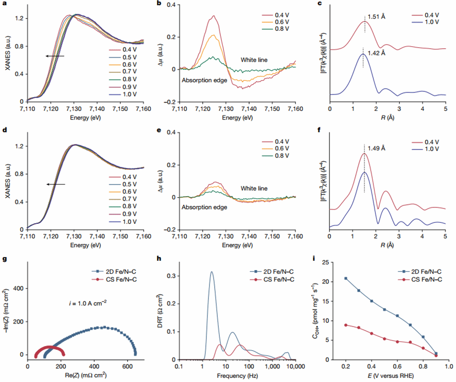 PEMFC测试显示,CS Fe/N-C的输出性能优异,且具有长期稳定性。H2-air(1.0 bar)下峰值功率密度达0.75 W cm-2,2.0 bar条件下为0.78 W cm-2;H2-O2体系下提升至1.25/1.44 W cm-2 (1.0/2.0 bar);经30,000次AST循环后,在0.8 V下仅衰减56 mA cm-2;在0.6 V恒压下运行303小时,仍保留86%初始电流。原位同步辐射XAS表明CS Fe/N-C具有更快的反应动力学;EIS-DRT分析显示其电荷转移与O2传输阻抗更低;EPR证实其·OH生成速率显著降低,印证了“外层抑制自由基侵蚀”的设计策略。