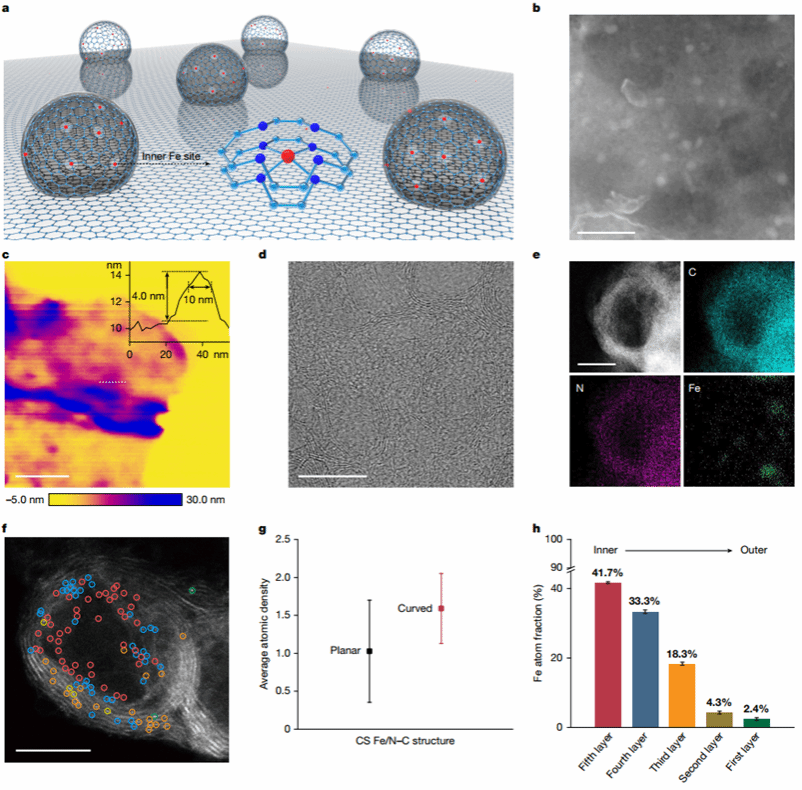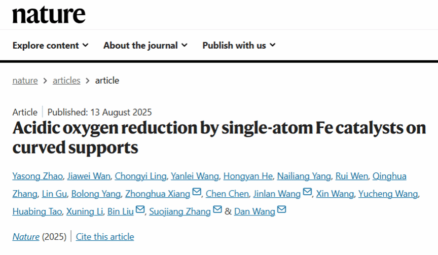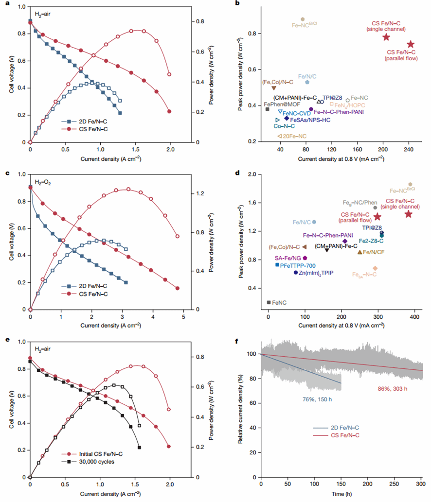 针对上述问题,深圳大学王丹教授与其合作者基于纳米级中空多壳层结构(HoMS),创新性地开发出“高曲率内壳层活化位点+带负电外壳层防护促脱”的曲面铁单原子催化剂(CS Fe/N-C)。该结构将Fe单原子主要镶嵌在纳米Fe/N-C HoMS的内壳层,铁原子缺失的外壳层既不妨碍氧气在内壳层的吸附活化,又可促进中间体脱附,还可抑制羟基自由基侵蚀,构建出独特的“外护内催”微环境。实验结果表明,该催化剂在PEMFC中实现了0.75 W cm⁻²(H₂–air, 1 bar)峰值功率密度,并在300小时连续运行后保持86%活性,实现了非贵金属体系PEMFC前所未有的最优综合性能。相关成果以“Acidic oxygen reduction by single-atom Fe catalysts on curved supports”为题发表于Nature《自然》期刊上(DOI:10.1038/s41586-025-09364-6)。论文通讯作者是王丹教授、向中华教授、王金兰教授、刘彬教授、张锁江院士。第一作者是赵亚松博士。