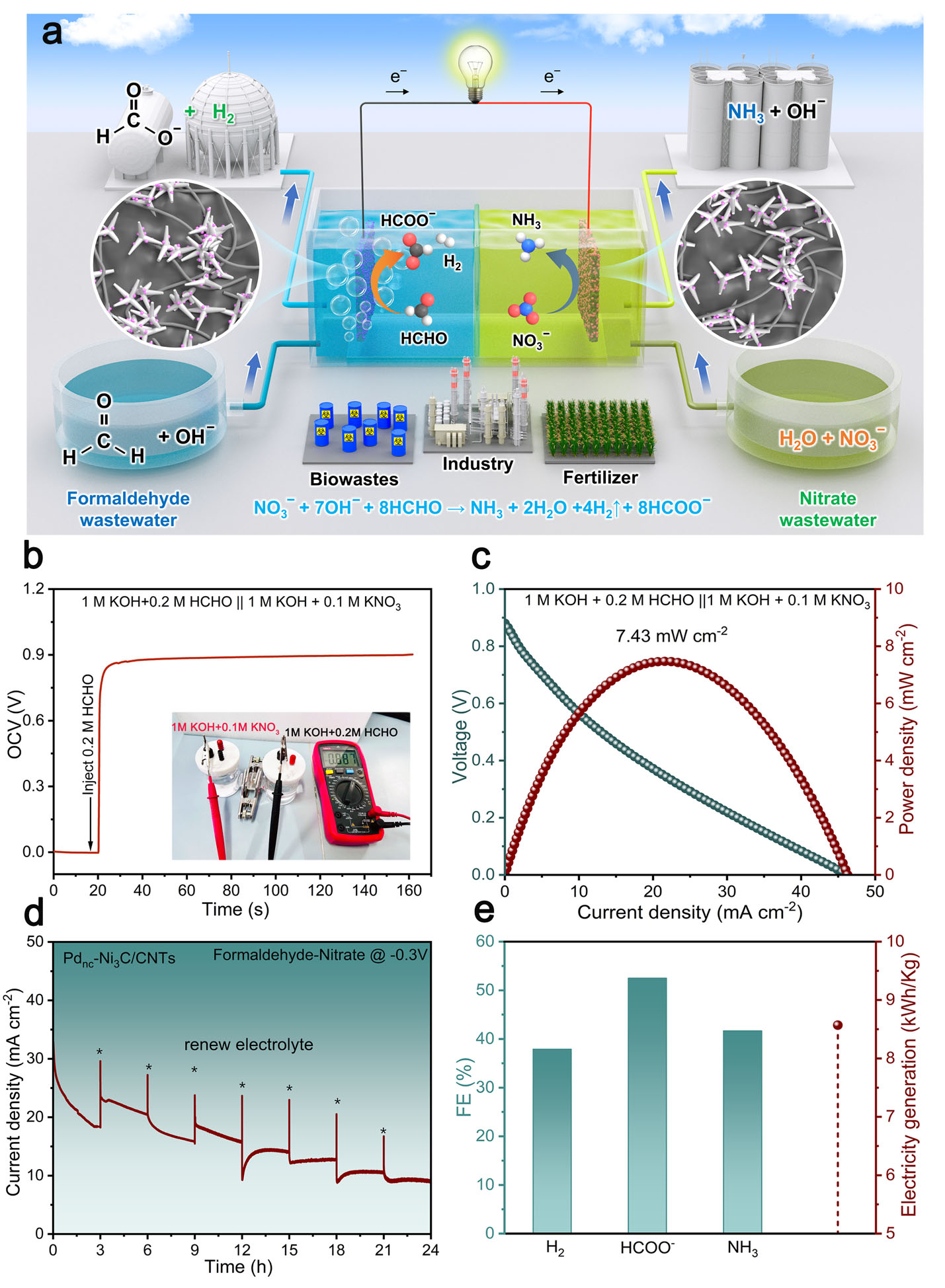 本工作提出一种非铜基双功能催化剂——负载于碳化镍(Ni3C)上的钯纳米团簇(Pdnc-Ni3C),该催化剂凭借卓越的H*交换能力,精准调控H吸附与传递行为,实现NO3RR与FOR的双向催化。上述H*利用和转移机制,采用同位素标记的原位谱学方法进行了深入表征。在阴极NO3RR侧,Pdnc-Ni3C展现出+0.27 V vs. RHE的起始电位,并在−0.3 V vs. RHE下取得98%的产氨法拉第效率;阳极侧FOR的起始电位低至0.04 V vs. RHE,且具备0 ~ 1.2 V vs. RHE的宽氧化窗口与高达910 mA cm−2的高电流密度,性能显著优于既往报道的铜基及镍基体系。这应是首次报道镍基催化剂用于低电位选择性甲醛氧化,其中Ni3C与Pd团簇的协同效应显著提升了电流密度,并高效促进了单电子转移路径下的快速产氢。差分电化学质谱(DEMS)首次揭示甲醛选择性氧化析氢的“分子间耦合路径”,深化了对单电子甲醛氧化机制的认知。通过耦合NO3RR与FOR,成功构建了开路电压达0.88 V、峰值功率密度为7.4 mW cm−2的高性能“甲醛-硝酸盐”原电池。尤为重要的是,本工作采用镍基催化剂(而非铜基催化剂),成功驱动“FOR-NO3RR”电池实现“四合一”多功能集成:在发电的同时,可将废弃物转化为H₂、NH₃和甲酸盐,展示了化学增值与能源生成协同的策略。