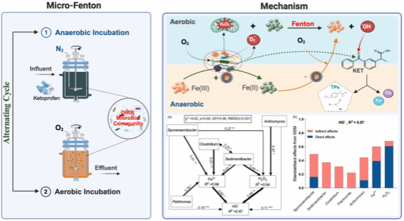 这项研究首次证实,利用天然富集的兼性厌氧铁还原菌群,可在构建“自维持微生物芬顿系统”,实现近中性环境中药物类新污染物的高效降解。其核心优势在于突破酸性限制,无需pH调节,广泛适应自然水体环境;通过微生物群落代谢协同实现 Fe2+ 和H2O2的原位持续产生,降低能耗与化学试剂消耗。这项技术不仅为制药废水治理提供了新方案,还加深了对水环境“微生物—铁氧化还原循环—污染物降解”耦合机制的理解,为开发更多低碳环境修复技术奠定基础。