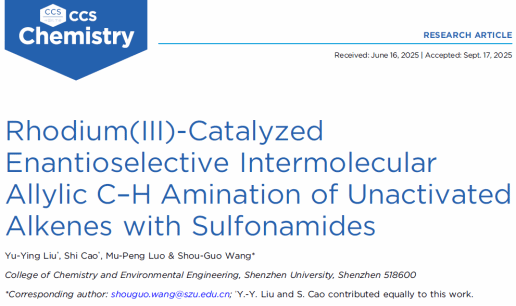 近日,深圳大学化学与环境工程学院王守国团队在中国化学会旗舰期刊《CCS Chemistry》(影响因子9.2,中科院JCR 1区,TOP期刊)上发表了题为《Rhodium(III)-Catalyzed Enantioselective Intermolecular Allylic C–H Amination of Unactivated Alkenes with Sulfonamides》的研究论文。该论文由王守国特聘教授担任唯一通讯作者,硕士研究生刘玉英和助理教授曹石为论文共同第一作者,深圳大学为唯一通讯单位。