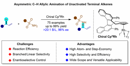 手性烯丙胺是一类在药物、天然产物及农药中广泛存在的核心活性结构,具有重要的生物和合成价值。传统的制备方法往往依赖复杂的预官能化底物或贵金属催化反应,效率较低且原子经济性不佳。相比之下,若能直接利用廉价且结构多样的非活化末端烯烃进行不对称C–H键胺化,将大大简化合成路线。然而,由于反应活性低、选择性控制困难,该策略长期被认为是有机合成领域的技术难题。针对这一科学问题,团队提出了创新性研究思路:以原位生成的高价碘亚胺化合物为氮宾前体,在手性环戊二烯基铑(III)催化剂作用下,通过金属–烯烃配位与烯丙位C–H活化形成π-烯丙基–Rh中间体,并实现立体选择性的C–N键偶联,从而在非活化末端烯烃上高效引入磺酰胺基团。研究团队最终建立了手性环戊二烯基铑CpxRh(III)催化体系,实现了非活化末端烯烃与磺酰胺之间的高对映选择性分子间烯丙位C–H胺化反应。该方法具有反应条件温和、底物范围广、支链与对映选择性优异、原子经济性高等突出优势,并可广泛应用于复杂生物活性分子的后期修饰和多种含氮骨架的构建。本项研究不仅为手性烯丙胺的高效合成提供了全新平台,也展示了C–H键直接官能化策略在有机合成与药物化学中的广阔应用前景。