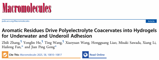 近日,新进“百人计划”特聘副教授范海龙在水下黏附材料领域取得重要进展:他们受自然界相分离体系中的固有无序蛋白氨基酸序列启发,研发出一种无需外部刺激即可自发实现相分离与相转变的凝聚层(coacervate)体系,该材料不仅在水下展现出卓越的黏附性能,还能在油环境中稳定工作,相关成果发表于《Macromolecules》。范海龙副教授、北海道大学龚剑萍教授为共同通讯作者,深圳大学化学与环境工程学院为第一完成单位。