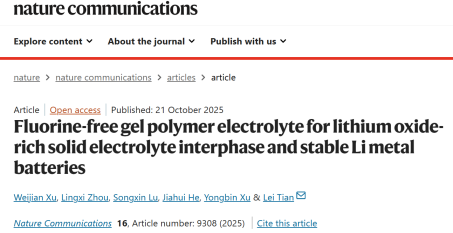 近日,深圳大学化学与环境工程学院田雷课题组在Nature Communications期刊上发表题为《Fluorine-free gel polymer electrolyte for lithium oxide-rich solid electrolyte interphase and stable Li metal batteries》的研究论文。团队成员22级硕士研究生许伟健为论文第一作者,田雷副教授为论文独立通讯作者,深圳大学为第一作者单位及通讯单位。