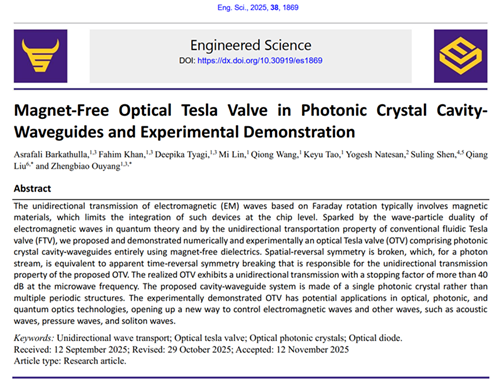 近日,物理与光电工程学院光电子器件与系统教育部重点实验室和深圳市微纳光子信息技术重点实验室成员,欧阳征标教授团队在期刊《Engineered Science》(中科院1区top期刊)上发表了题为“Magnet-Free Optical Tesla Valve in Photonic Crystal Cavity-Waveguides and Experimental Demonstration”的研究论文。该研究创新性地提出了基于光子晶体微腔波导的光学特斯拉阀并进行了实验验证。博士生Asrafali Barkathulla为论文的第一作者,欧阳征标教授和东莞理工学院的刘强教授为论文的共同通讯作者,深圳大学为第一完成单位和通讯作者单位,印度科泽科德卡利卡特国立理工学院为合作单位。