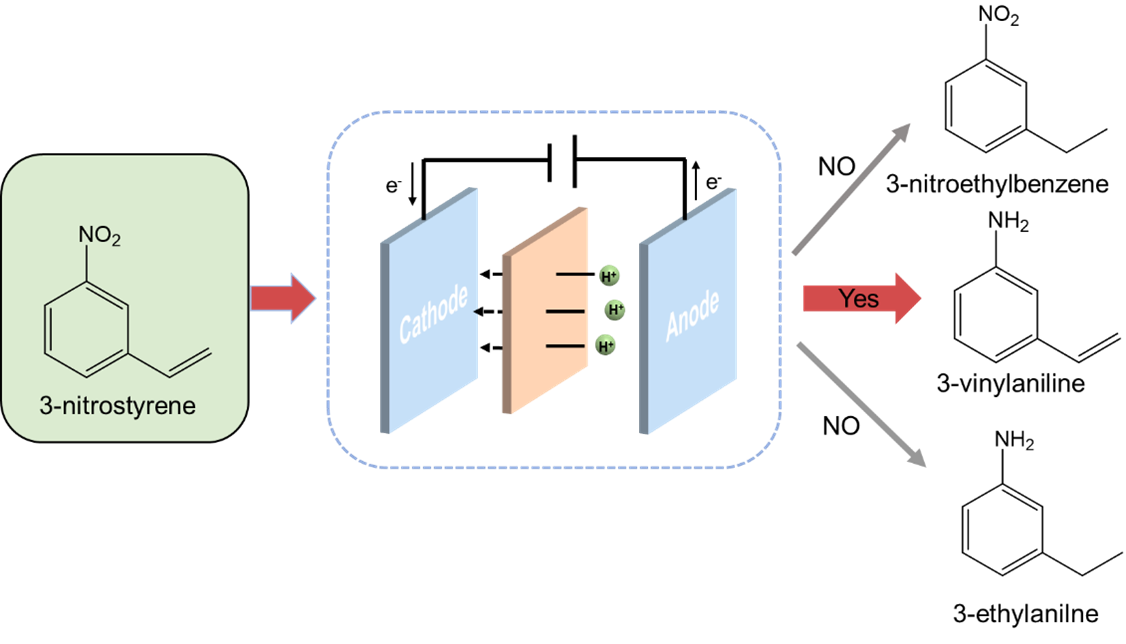 机制研究表明,该催化剂能够优先吸附并活化硝基(-NO2),同时有效抑制了热力学上更易反应的碳碳双键(C=C)的还原。这一机制从源头上解决了选择性控制的难题,实现了硝基(-NO2)向氨基(-NH2)的高效转化,同时完好保留了碳碳双键(C=C)。性能测试结果全面超越当前文献报道的最高水平:该催化剂可在30 mA cm-2的电流密度下(约为以往最佳研究的4.6倍)稳定工作,同时保持优异的选择性。在此条件下,目标产物3-乙烯基苯胺(3-VA)的法拉第效率和选择性分别高达79%和82%,生产速率更是达到0.146 mmol h-1 cm-2,较以往最佳水平提升2.1倍。该研究为功能化苯胺的绿色合成提供了一种极具竞争力的新技术路径,对推动精细化工行业的低碳转型具有重要的科学价值与现实意义。