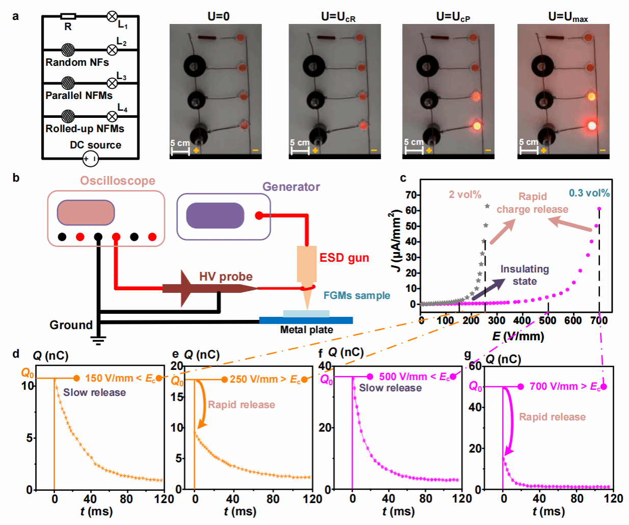 随着电子设备功率密度和集成度的显著提升,潜在的静电放电威胁不容忽视,长期电荷积累将严重威胁电子器件的可靠性。具有可逆导电-绝缘性能的非线性电导复合电介质被视为自适应消散电荷的有效解决方案。然而,基于传统“背靠背”双肖特基势垒结构的复合电介质非线性系数和阈值场强难以精确调控,更重要的是,为构建长程渗流路径往往需要较高的填充体积(超过30%)。因此,对低填充、高稳定性、可灵活调控的导电-绝缘可逆电介质研究和开发迫在眉睫。基于上述问题,本研究提出了一种基于大面积静电纺丝技术的梯度掺杂策略,实现超低渗流阈值下的高稳定非线性电导复合电介质。该策略通过大规模同轴静电纺丝制备具有电场自适应调控功能的纳米纤维膜,与传统“背对背”双肖特基势垒结构不同,该纳米结构具有可通过材料组成设计独立调控两侧势垒高度的非对称“阶梯式”双肖特基势垒,从而实现对非线性系数的精确调控,以应对多样化应用场景需求。此外,该纳米纤维膜可灵活组装成多种取向构型,使得优化后的纳米复合材料能够在创纪录的超低填充量(0.3 vol%)下实现绝缘-导电态灵活转换。特别地,我们通过发光二极管(LED)与静电放电(ESD)抗扰度测试,验证了该功能梯度材料在实际应用中的可靠性。