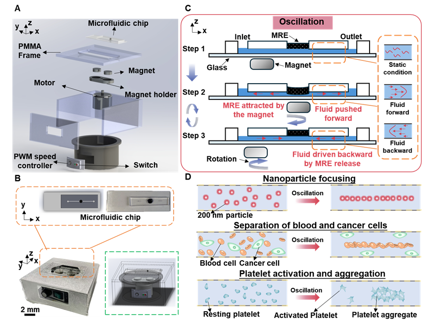微流控中的振荡流在颗粒聚焦、细胞分离和力学生物学研究中具有重要应用价值,但现有振荡微流控系统通常依赖外部泵源、阀门或复杂片上驱动单元,限制了其便携性、生物相容性和应用场景。开发一种结构简单、易于制备且无需外部精密驱动的振荡微流控平台,对于推动无泵微流控技术的发展具有重要意义。