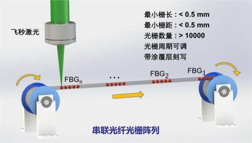 光栅波长、光栅反射率、光栅间距、光栅数量等参数可根据用户需求订制。该大规模光纤光栅阵列在油井勘探、周界安防、桥梁大坝、航空航天等分布式光纤传感领域具有广泛应用前景,可以极大地提高DAS、DTS、OFDR等分布式光纤传感技术的测量精度、测量距离和空间分辨率等关键指标,是分布式光纤传感技术的“助推器”。
