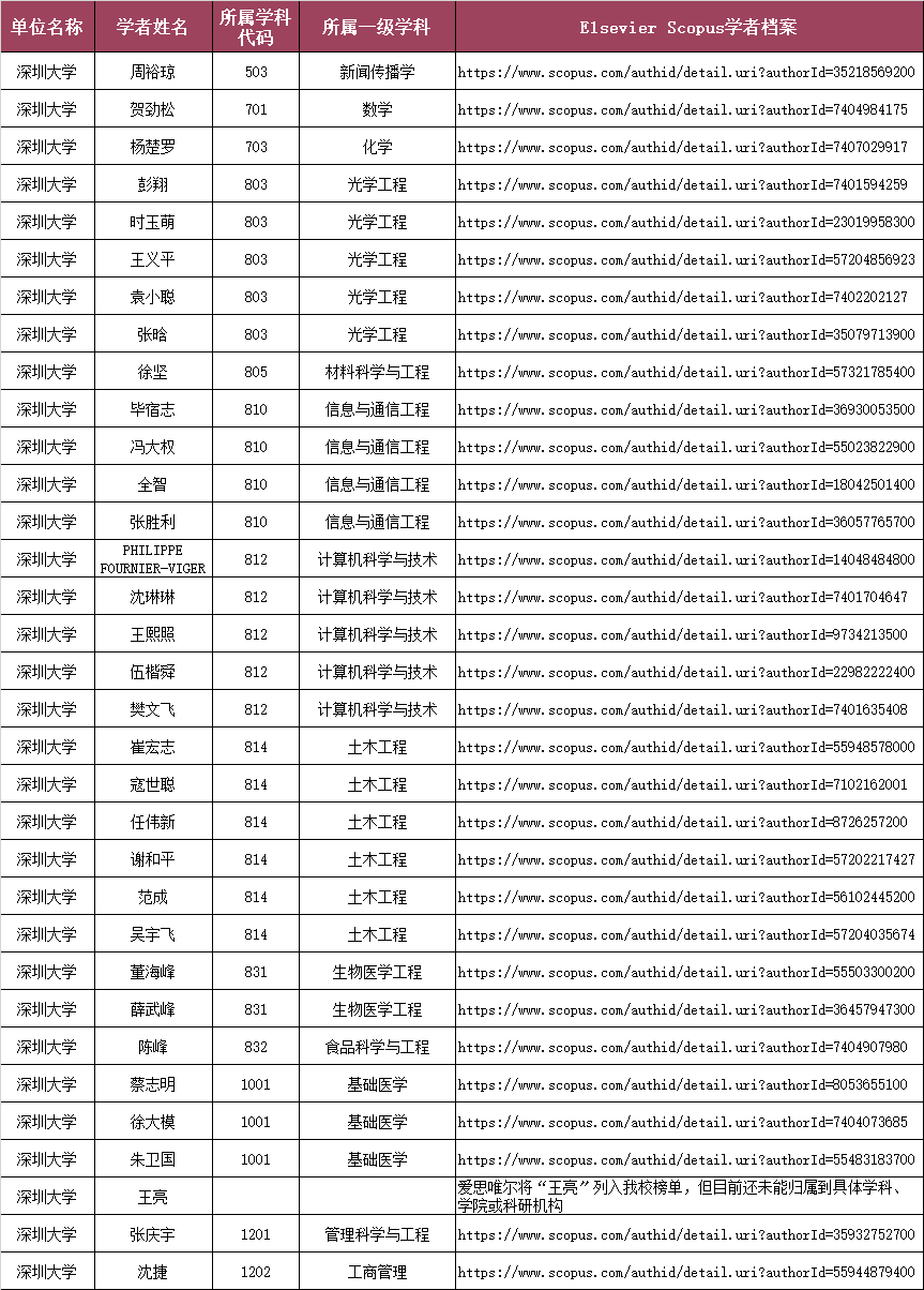 深圳大学入选学者名单