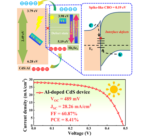 提出了一种异质结界面优化策略,通过在CdS缓冲层中引入Al3+离子并进行热处理,Sb2Se3/CdS:Al异质结的能带排列可有效地由“悬崖状”结构转变为理想的“长钉状”结构,从而降低异质结界面缺陷浓度,抑制载流子非辐射复合,提高太阳电池性能;最后总结分析Sb2Se3薄膜太阳电池载流子动力学优化机制对太阳电池效率进一步提升具有重要意义。相关研究成果发表在Advanced Functional Materials (2023) 2213941(影响因子:19.924),梁广兴和陈烁为论文通讯作者,其指导的联合培养博士研究生罗燕娣为第一作者,深圳大学为唯一通讯单位。