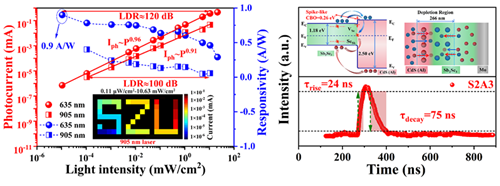 Sb2Se3在新型高效低成本薄膜光电探测器研究领域引起广泛关注,主要由于以下优势:(1)一维晶体结构,探测器像素之间无横向串扰:Sb2Se3具有一维晶体结构(c方向为共价键,a和b方向为弱范德华力相互作用),强各向异性促使载流子沿着[Sb4Sb6]n链有效地运输,在链间则以hopping形式传输,利于消除探测器横向串扰;(2)缺陷存在互补偿:Sb2Se3天然存在VSb、VSe等点缺陷,对应的缺陷深度为0.4~0.7 eV,有望利用缺陷吸光进行非本征探测将探测波段拓宽至2000 nm;(3)Sb2Se3具有较低的结晶温度(133°C),相应探测器与CMOS工艺高度兼容。本文采用溅射硒化法制备了[hk1]择优取向生长的Sb2Se3薄膜,构建优异的Sb2Se3/CdS平面异质结光电探测器。为了进一步提升器件性能,利用Al3+掺杂CdS缓冲层,降低界面缺陷密度和体缺陷密度、增加耗尽层宽度以及优化p-n结界面能带排列,进一步降低器件的载流子复合,提升载流子输运能力。基于此,该薄膜光电探测器能够实现无外加偏压自驱动工作,响应度提升至0.9 A/W、探测度达到4.78×1012 Jones、开关比高达106、线性动态范围高达120 dB、响应速度首次达到ns量级(响应时间24 ns和恢复时间75 ns)。相关研究成果发表在InfoMat (2023) e12400上(影响因子:24.798),陈烁为论文第一作者,其指导的硕士研究生付毅为第二作者,梁广兴为通讯作者,深圳大学为唯一通讯单位。
