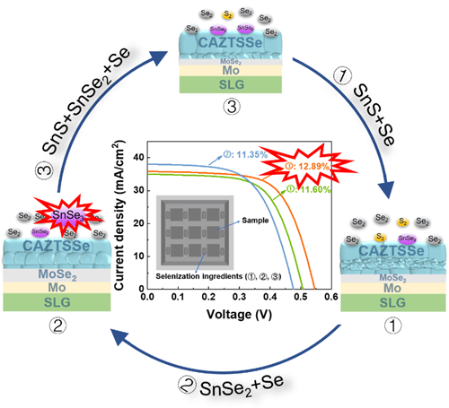 锌黄锡矿半导体Cu2ZnSn(SxSe1-x)4(CZTSSe)因其廉价无毒的元素组成以及具有大于32%的理论光电转换效率成为很有前途的薄膜光伏材料之一。近年来CZTSSe薄膜太阳电池的效率不断攀升,但仍远低于其理论值,这主要归因于较大的开路电压亏损。本文采用非真空绿色环保的溶胶凝胶法结合硒化热处理生长CZTSSe薄膜,深入剖析硒化反应机理,首次阐明了抑制锡损失的蒸气成分(气态SnSe3)以及SnSe3促进CZTSSe形成路径;并在SnS和SnSe2粉末以及Se粒结合的硒化条件下获得了高结晶度且成分可控的光吸收层CZTSSe薄膜,其后构建CZTSSe薄膜太阳电池进行物理分析,研究表明,高结晶质量的吸收层薄膜使得晶界处的能带弯曲程度最优以及有效抑制了界面复合。此外,CuZn和CuSn反位缺陷浓度显著降低,开路电压从508 mV提高到546 mV,最终获得在空气环境中制备CZTSSe薄膜太阳电池的最高光电转换效率12.89%。相关研究成果发表在Advanced Energy Materials (2023) 2300521(影响因子:29.698),梁广兴和苏正华为通讯作者,其指导的硕士研究生于紫轩为第一作者,深圳大学为唯一通讯单位。