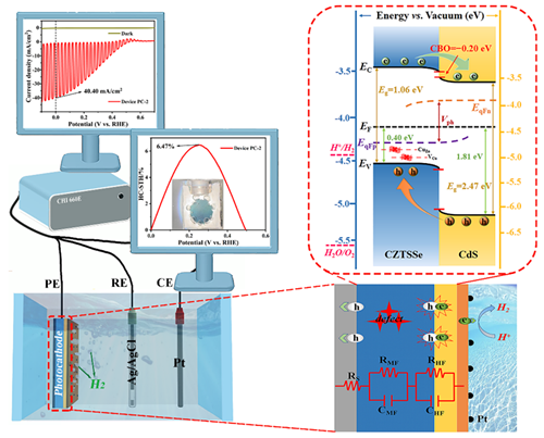 基于CZTSSe薄膜优异的光电性能,构建出Glass/Mo/CZTSSe/CdS/TiO2/Pt薄膜光电阴极实现太阳光水解制备“绿氢”;通过协同光吸收层薄膜和异质结界面性能优化,显著地抑制界面非辐射复合损失,从而提升电荷的分离和转移效率,将CZTSSe薄膜光电阴极的光电流密度提升至目前已报道的最高值40.40 mA cm−2, 接近其理论光电流密度值42.85 mAcm−2;同时,获得6.47%的半电池太阳能-氢能转化效率。相关研究成果发表在Advanced Energy Materials (2023) 2300215上(影响因子:29.698),梁广兴为论文第一作者,其指导的硕士研究生李志东为第二作者,陈烁为通讯作者,深圳大学为唯一通讯单位。
