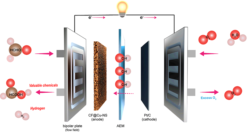该研究中团队采用铜纳米片阵列电极作为高活性的阳极,该阳极反应是实现直接甲醛燃料电池在发电同时产氢和产甲酸盐的关键。与传统的碳基分子电氧化不同,铜电极能够高选择性(~ 100%)地将甲醛氧化为甲酸盐和H2,而不经历CO2途径。此外,微分电化学质谱(DEMS)和密度泛函理论(DFT)计算结果表明,Cu表面的活性H原子来源于醛基中C-H键的断裂,且更倾向以H2而不是H2O的形式释放。该研究为碳基分子燃料的高效利用开辟了一个无二氧化碳排放的发展方向,也为甲醛的环保处理、有价值化学品的生产和燃料电池发电提供了一种创新策略。