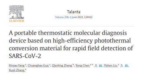 该研究成果以Short Communications的形式发表在分析化学领域著名期刊Talanta(影响因子6.556,中科院1区,TOP期刊)上,题目名为“A Portable Thermostatic Molecular Diagnosis Device based on High-efficiency Photothermal Conversion Material for Rapid Field Detection of SARS-CoV-2”的研究成果。深圳大学化学与环境工程学院21级化学创新班本科生杨欣瑶为论文第一作者,陈勇副研究员和刘翼振副教授为论文的共同通讯作者,深圳大学为第一完成单位,全文链接见:https://www.sciencedirect.com/science/article/pii/S003991402300173X