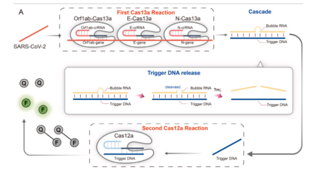 针对上述问题,深圳大学刘翼振分子诊断技术课题组在CRISPR/Cas分子诊断方向取得重要进展,提出的aM-level sensitive cascade CRISPR-Dx system(ASCas)系统是一种级联多种CRISPR/Cas酶信号放大能力的免扩增、高灵敏度(1 aM)和快速(20分钟)的SARS-CoV-2病毒的RNA检测。在ASCas系统中,高灵敏度和高转切效率的Cas13a核酸酶能够在低浓度的靶向RNA检测中迅速剪切级联探针上的RNA气泡,从而破坏级联探针并释放出大量的触发DNA,用于进一步的二级Cas12a反应信号放大。ASCas系统能快速检出aM级别的SARS-CoV-2的RNA,并且无需逆转录和预扩增。这一突破性的免扩增CRISPR-Dx技术摆脱了因扩增反应导致的气溶胶污染风险,大大降低了分子诊断的环境和人员技能要求。此外,ASCas系统通过编程设计Cas13a-crRNA来取代复杂的引物和探针筛选过程,从而可以更快速、更直观地构建适用于易突变的SARS-CoV-2等RNA病毒的检测体系。