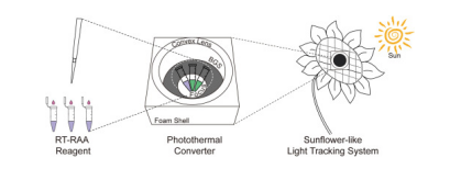为了解决这一问题,刘翼振课题组成功建立了一种基于太阳能光热转化策略的便携式(<300克)、低成本(<$10)、可重复使用的分子诊断设备。独创性地引入了类向日葵的自动光追踪系统,提高了太阳光能利用率,使得该设备适用于高光和低光环境。实验证明,该设备能够在30分钟内检测到低至1 aM的SARS-CoV-2核酸样本。