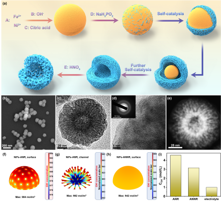 在本工作中,何传新教授团队首次将非晶与纳米反应器相结合,设计合成了一种具有微通道结构的非晶镍铁氧化物作为OER电催化剂,大幅提升了水分解速率,并通过有限元计算揭示了非晶纳米反应器促进水氧化反应的内在机制。温和的自催化反应被用于镍铁氧化物基非晶纳米反应器(NiFe-ANR)的制备。前驱体发生反应生成氢氧化镍铁纳米球后,在自催化的作用下,逐渐在纳米球外部生长了非晶的镍铁氧化物网格。与此同时,内部的氢氧化镍铁被不断消耗,形成中空结构。最终,经硝酸清洗后,则可获得中空多通道的非晶纳米反应器结构。在电催化水氧化中,NiFe-ANR的非晶结构有助于将其转化为高活性的羟基氧化物,并且长程无序短程有序的非晶特性为其带来许多微小晶界,从而增加了活性位点。此外,实验和有限元分析证明,纳米反应器结构改变了催化剂的空间曲率和传质过程,实现了在催化剂表面富集OH-的效应。