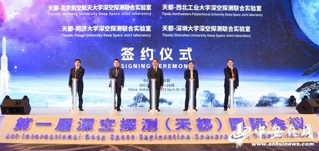 4月25日上午,第一届深空探测(天都)国际会议暨主论坛在安徽合肥拉开帷幕,这次会议的主题是“合作共赢·飞向深空”,深圳大学周辉副校长率队参加了会议,深圳大学科技部主任崔宏志教授、深圳大学土木与交通工程学院谢和平院士、黄少鹏教授、李存宝助理教授、宋蜜博士以及深圳大学高等研究院朱平教授和丁春雨助理教授等随同参会。会场上举行了多个联合实验室的合作协议签约仪式,周辉副校长代表深圳大学与深空探测全国重点实验室主任、中国探月工程总设计师吴伟仁院士以及北京航空航天大学、西北工业大学、同济大学的领导一起按下了签约键。