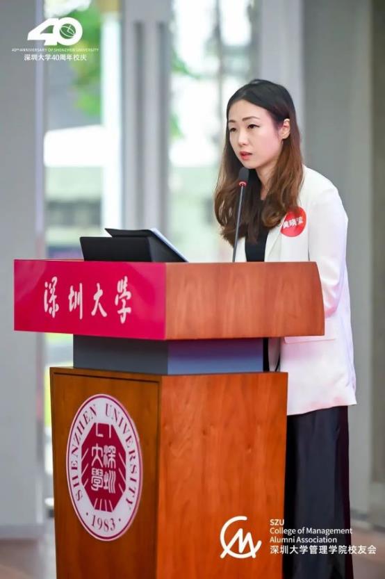 深圳大学校友会管理学院分会副会长兼任联席秘书长黄晓莹向大家介绍了“深大校友杯”IPP创新精英大奖赛的情况和训练营的安排。IPP创新精英大奖赛致力于为全校有志于创新探索的同学及校友提供更为广阔的学习、锻炼和推广的平台。大赛创新性地分为三个赛道:创意构想(Idea)赛道、创新计划(Plan)赛道、创业项目(Project)赛道,目前已公布初赛结果,接下来将会向70个入围项目提供赛中培训,配备优秀的校友导师一对一辅导。