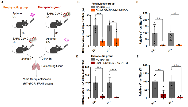 CRISmers理论上具有广泛的靶向性,但考虑到研究进行期间正值新冠疫情,该团队将第一个靶标指向了SARS-CoV-2刺突蛋白受体结构域RBD。通过初级筛选和二级验证,获得了可特异靶向RBD的2个优选的RNA适配体,且在体外呈现出有效的病毒检测和中和活性。有趣的是,和其他论文中报道的一致[6],核酸配体表现出不受病毒突变影响的现象,具有广谱抗SARS-CoV-2的潜力。这一现象也许和核酸配体内在的柔性结构特性有关。类似的,不同的CRISPR/Cas系统的向导RNA也观察到可以互换的现象[7]。进一步,选取其中一条RNA适配体,团队发现,结合多种修饰和偶联,包括2’-氟嘧啶和2’-甲氧基RNA修饰(提升RNA稳定性),以及5’端胆固醇(呈递到呼吸道上皮细胞表面)和分子量为40kDa的聚乙二醇(延长体内半衰期)的偶联,经滴鼻给药,在小鼠体内实现了对Omicron BA.2活病毒的预防型和治疗型抗病毒中和活性。通过对比实验,团队发现胆固醇和聚乙二醇的偶联对于动物体内的活性不可或缺,尽管它们对于细胞水平上的中和活性可有可无。