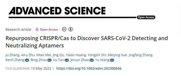 5. Zhang, J., et al., Repurposing CRISPR/Cas to Discover SARS-CoV-2 Detecting and Neutralizing Aptamers. Adv Sci (Weinh), 2023: doi.org/10.1002/advs.202300656.