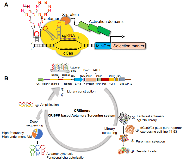 核酸适配体(aptamer)由诺奖获得者Jack Szostak命名[1],是一类短的、单链DNA(ssDNA)或RNA寡核苷酸,通过形成三维空间结构,结合特定蛋白或者细胞发挥作用。基于其独特的生物学和化学特性,核酸适配体正在用于诊断试剂和治疗药物的开发[2]。指数富集的配体系统进化技术(SELEX)是核酸适配体筛选的金标准方法,主要基于核酸文库与目标蛋白或细胞在溶液中或者在细胞表面的亲和力作用,再结合深度测序捕获富集序列[3]。与此同时,对CRISPR/Cas的改造,已经拓展出远远超过其天然核酸酶的功能,发展出了转录调控、表观遗传调控、基因组标记等丰富多彩的应用[4]。