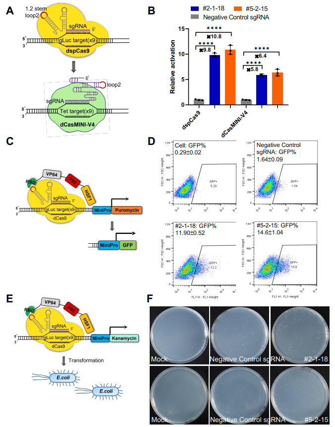 最后,该团队还对CRISmers系统的通用适配性进行了验证。应用靶向SARS-CoV-2 RBD筛选获得的两个RNA配体,对CRISmers系统中的元件分别进行了替换,包括(1)将dSpCas9替换成更小体积版本的dCasMINI-V4[8-10](2)将抗性基因替换成荧光蛋白;(3)将筛选宿主细胞由人HEK293T细胞系替换成大肠杆菌,均可捕获到RNA配体与RBD的亲和力信号。