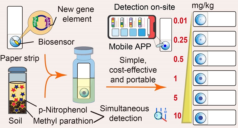 全球公众关注的一个重要问题是有机磷农药及其初级代谢产物造成的土壤污染。为了保护公众健康,现场筛查这些污染物并确定其土壤生物有效性变得尤为重要,但这项工作仍然具有挑战性。该工作改进了已有的有机磷农药水解酶(mpd)和转录激活因子(pobR),并首次设计并构建了一种新型生物传感器(Escherichia coli BL21/pNP-LacZ),其可低背景值的精确检测甲基对硫磷及其主要代谢物对硝基酚。为了制作纸条生物传感器,使用生物凝胶海藻酸盐和敏化剂多粘菌素B,将E. coli BL21/pNP-LacZ固定在滤纸上。根据土壤提取物纸条生物传感器的校准和标准曲线,通过移动应用APP收集的纸条生物传感器上的颜色强度可用于计算甲基对硫磷和对硝基酚的浓度。该方法的对硝基酚和甲基对硫磷的检测限为5.41 µg/kg和9.57 µg/kg。实验室和田间土壤样品中对硝基酚和甲基对硫磷的检测验证了这一方法。现场纸条生物传感器以简单、廉价和便携的方法对土壤中的对硝基酚和甲基对硫磷水平进行半定量测量。