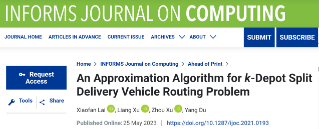 论文的引用信息:Xiaofan Lai, Liang Xu, Zhou Xu, Yang Du (2023) An Approximation Algorithm for k-Depot Split Delivery Vehicle Routing Problem. INFORMS Journal on Computing, forthcoming.