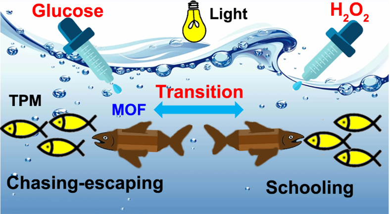 微生物常通过趋化相互作用而呈现出追逐-逃避和群聚等有趣行为。尽管已有人造系统展现类似仿生行为,但通过控制趋化相互而实现不同集体行为之间的转换却较为少见。在此工作中,高永祥团队发展了以葡萄糖和双氧水为燃料的纺锤状金属有机骨架 (MOF) 自推进光敏胶体马达。在不同燃料中,该马达显示出不同的趋化作用,可用于调控马达与惰性胶体混合体系的集体动力学:在葡萄糖和双氧水中分别表现为 “追逐-逃逸”和群聚行为。该行为的转变被归因于引起趋化的离子扩散泳作用方向的改变。该研究为调控胶体马达和惰性胶体之间通信提供了新的策略,对于活性物质基础研究和货物运输、化学传感等应用研究均有重要意义。