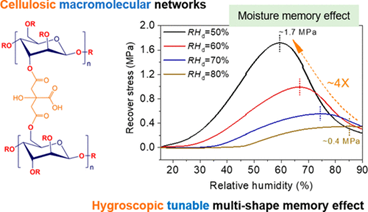 本研究工作报道了具有超分子中间相网络结构的纤维素衍生物聚合物的吸湿可调多重形状记忆效应。由动态氢键搭建的超分子网络结构使聚合物在较宽的相对湿度范围内呈现出显著的力学响应特性。在宽范围可调的相对湿度的独立调控下,聚合物在室温条件下表现出双、三、四重形状记忆行为,并展现出一种独特的湿度记忆效应。这种新颖的湿度记忆效应可以类比于传统热响应形状记忆材料的温度记忆效应,对材料可编程形状记忆行为的精确调控具有重要意义。此外,该聚合物在形状固定率、恢复率和循环稳定性方面均表现出优异的性能。论文详细研究并阐述了该种新型湿度调控多重形状记忆效应的发生机制,为挖掘构建更多非热适型多重形状记忆高分子材料体系提供了一定的理论依据和指导。这种由湿度调控的多重形状记忆聚合物有望在恒温环境中进行自主、快速、可编程的形状驱动,在生物医学领域显示出巨大的应用前景。