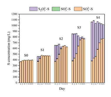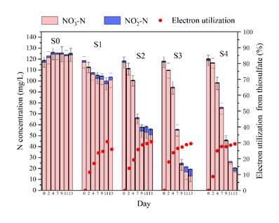 如图1所示,以硫代硫酸盐为电子供体的S1-S4生物反应器对硝酸盐的去除效果明显,而S0生物反应器对硝酸盐几乎没有还原作用。S1-S4生物反应器对硫代硫酸盐驱动自养反硝化的硝酸盐去除率分别为14.0%、56.5%、88.9%和85.0%,表明S/N比的提高可以实现高效的硫代硫酸盐驱动的硫自养反硝化效率。有趣的是,S1-S4反应器的自养反硝化电子利用率分别约为26%、31%、29%和29%。结果表明,随着S/N比的提高,硫代硫酸盐驱动的自养反硝化保持了稳定的电子利用效率。