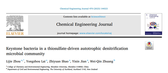 近日,深圳大学化学与环境工程学院周礼杰副教授团队在期刊《Chemical Engineering Journal》(影响因子15.1,中科院JCR 1区,TOP期刊)上发表了题为《Keystone bacteria in a thiosulfate-driven autotrophic denitrification microbial community》的研究论文。该团队周礼杰副教授为论文第一作者及通讯作者,深圳大学为第一作者单位及通讯单位。