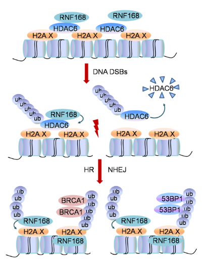 HDAC6是一种广泛表达的HDAC Ⅱb家族的组蛋白去乙酰化酶。据报道,HDAC6可作为去乙酰化酶和泛素酶参与DNA损伤中的错配修复(MMR)及核苷酸切除修复(NER)两种途径。然而,HDAC6是否参与DSB修复尚不清楚。RNF168作为一种经典的E3泛素连接酶参与调节多种泛素信号通路,RNF168催化的H2A/H2AX泛素化是DSB损伤修复中的关键步骤,其可作为平台参与下游修复因子的招募。任何调节RNF168-H2A/H2AX泛素化状态的因素,都可能影响DSB修复效率。因此,阐述其他潜在的精确调控RNF168-H2A/H2X信号轴的分子,对于了解基因组稳定性调控具有重要意义。