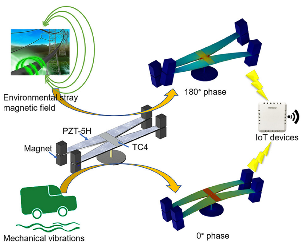 环境中蕴藏有丰富的各种形式能量,除了大家关注的光能、热能、风能,波浪能,其实城市环境中还普遍存在被人们忽视的振动能、磁场能。这些遍地存在的微弱能量其实也可以被采集,用于城市环境中的海量传感器自供电与物联网,从而解决大面积分布式供电,或者海量化学电池供电所产生的各种弊端。虽然目前学者们发展了各种压电式、磁电式能量采集器件,但针对环境中的微弱振动能、微弱磁场能的采集,发电能力十分微弱、有限。为了解决这一问题,受自然界蜻蜓两对(四个)翼状翅膀的高效扑翼方式的启发,团队设计了一种仿蜻蜓扑翼式振动的磁-机-电耦合微能量采集器(DWL-EH)。这种新型器件拥有四个翼状磁电悬臂梁结构,并工作在两个交叉对称弯曲模态。这种设计大为增强了磁-机-电耦合,能够有效地收集城市环境中杂散磁场和微弱振动能量。在弱磁场(HAC = 3 Oe,f = 50 Hz)下,小型DWL-EH实现了创纪录的25.89 mWavg高输出功率,同时也具有迄今为止最高的振动能量采集功率密度。即使在1 Oe的交流弱磁场下,DWL-EH也能够产生足够的功率来直接持续点亮510个LED灯。此外,收集到的能量可以为多传感器物联网系统供电,用于实时环境监测。本研究表明,自然启发的设计原则可能是未来城市环境中与物联网设备集成的能量收集器的更有效策略。