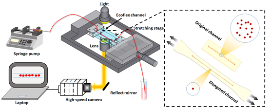 雨生红球藻是虾青素的良好来源,可减少人体氧化,治疗炎症,甚至减缓乳腺和皮肤癌症细胞的生长。由于雨生红球藻的大小通常与虾青素产量密切相关,基于尺寸大小的微藻分离对高价值藻类提取和藻类定向进化具有深远意义。粘弹性-惯性微流控能够在简单的直通道中实现三维聚焦,无需任何外力场或复杂的通道结构。颗粒尺寸是粘弹性-惯性聚焦和分离的主要参数,颗粒分离的截止阈值高度依赖于堵塞率。对于微藻细胞分离,细胞尺寸是预先确定的,调整阻塞率需要改变微流体通道的直径。然而,一旦在现有的刚性微流控设备中完成管道设计,通道几何形状就很难改变,所以目前的刚性设备不能用于分离截止尺寸不确定的微藻分离。因此开发一种可拉伸微流控,能够实时灵活地调整微流控芯片的几何形状,实现微藻分离截止尺寸的动态调整,具有一定的研究价值。