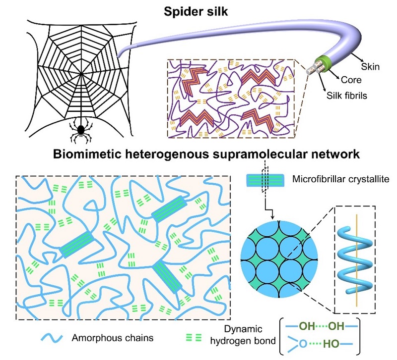 为了适应复杂多变的环境,自然生物进化出了丰富的自适应力学行为,如应变增强、高阻尼和在自然环境条件下的响应驱动特性。具有自适应力学特性的先进智能材料在生物医学领域和仿生设计中具有巨大的应用前景。然而,设计并制备具有多种自适应力学特性的智能材料仍然面临着巨大挑战。深圳大学高等研究院黄思雅研究员课题组以蜘蛛丝的分子化学和结构为灵感,通过蒸发诱导氢键大分子自组装,构建了一种具有多种自适应性的异质结构超分子网络。