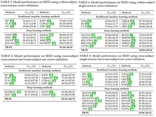 PR-PL的模型架构设计如图一所示。(1)结合原型特征学习(Prototypical Learning)和DANN网络,寻找普适、共享、信噪比高的情绪原型特征。通过双线性变换揭示样本特征与原型特征之间的关系,并将其映射到分类空间,实现情绪分类。这种方法在减少脑电信号个体差异的同时,也有效减轻了DANN网络容易受到噪声干扰的问题。(2)发展配对学习方法,利用配对标签来评估两个脑电信号是否属于相同类别。因此,配对学习的训练过程无需依赖精确的标签信息,却能达到与样本分类学习相媲美甚至更优的性能。对于有标签信息的源域数据,团队提出有监督配对学习(Supervised Pairwise Learning)来取代传统的样本分类学习。这个方法有效缓解了DANN网络对于源域精确标签依赖性和易受标签噪声干扰的问题。(3)对于无标签信息的目标域数据,团队提出无监督配对学习(Unsupervised Pairwise Learning)和动态置信度阈值算法,以解决DANN网络仅关注源域数据可分性而导致过拟合的问题。由于目标域缺乏标签信息,团队提出利用动态变化的阈值来筛选置信度高的配对样本,并赋予伪标签(Pseudo Label)用于训练。通过无监督配对学习,推动模型关注目标域数据的可分性,提升其在目标域的泛化性能。